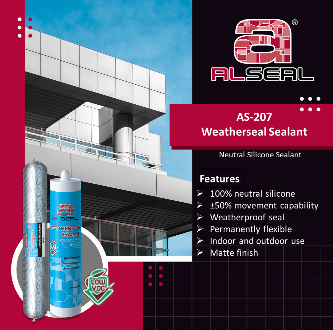 ALSEAL Weatherseal Silicone Sealant AS-207 is a one-component, non-slumping, high-performance, 100% neutral cure silicone sealant formulated with a calcium carbonate filler system. It gives superior adhesion and durability in a wide range of glazing, weather sealing, and trade applications. It has excellent resistance to weathering, UV radiation, vibration, moisture, ozone, temperature extremes, airborne pollutants, and many cleaning detergents and solvents.